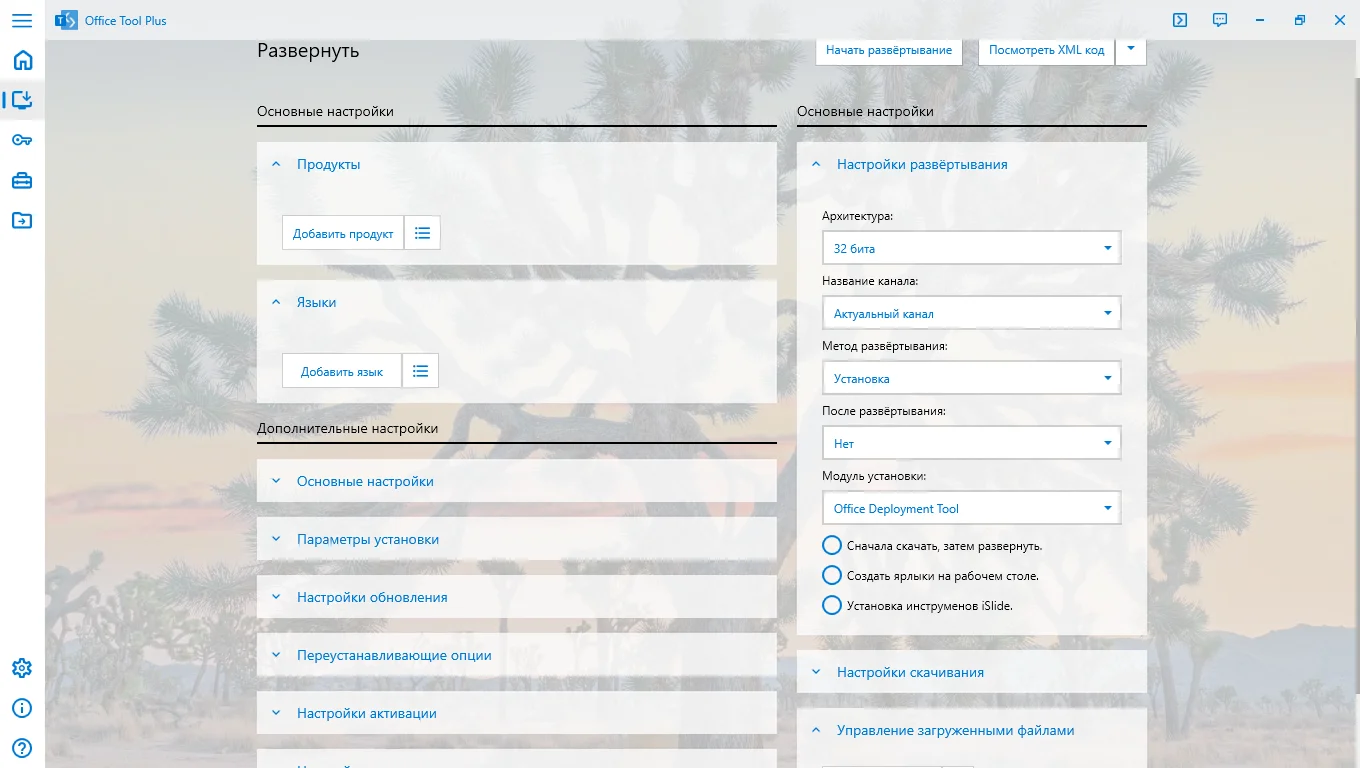 Office Tool Plus არის ფუნქციონალური პროგრამა, რომელიც შექმნილია Microsoft Office-თან სამუშაოდ. ის მომხმარებლებს საშუალებას აძლევს განაახლონ არსებული Office-ის ინსტალაცია, შეცვალონ განახლების არხები, წაშალონ ზედმეტი ენის პაკეტები და მთლიანად დეინსტალირონ Office სისტემიდან. მიუხედავად იმისა, რომ ის უშუალოდ არ ააქტიურებს Office-ს, ის უზრუნველყოფს საჭირო პარამეტრებს და შესაძლებლობებს აქტივაციისთვის, როგორიცაა პროდუქტის გასაღებების ინსტალაცია და KMS სერვერების კონფიგურაცია. პროგრამა გთავაზობთ ინტერფეისს, რომლის საშუალებითაც მარტივად შეგიძლიათ ჩამოტვირთოთ სასურველი Office-ის ვერსიები კონკრეტული ენის პაკეტებით და წაშალოთ არასაჭირო კომპონენტები. Office Tool Plus-ის ძირითადი მახასიათებლები მოიცავს XML კონფიგურაციის პროფილების შექმნას Office-ის სწრაფი განლაგებისთვის სხვა კომპიუტერებზე კონკრეტული კომპონენტებით. ის მხარს უჭერს Office-ის ჩამოტვირთვას ყველა Office არხსა და ენაზე, ასევე Office-ის ინსტალაციას ან არსებული ინსტალაციების მოდიფიკაციას პროდუქტებისა და აპლიკაციების დამატებით ან წაშლით. პროგრამას შეუძლია Office-ის ISO ფაილების შექმნა ნაგულისხმევი ან ავტომატური ინსტალაციის კონფიგურაციებით. ის მხარს უჭერს ონლაინ აქტივაციას, სატელეფონო აქტივაციას და KMS აქტივაციას, ასევე ლიცენზიების, გასაღებების და KMS-ის მართვას. მომხმარებლებს შეუძლიათ Office-ის განახლების არხების შეცვლა, რაც საშუალებას იძლევა განახლება ან დაქვეითება ხელახალი ინსტალაციის გარეშე. Office Tool Plus-ს შეუძლია Office-ის იძულებით წაშლა, მაშინაც კი, თუ სტანდარტული დეინსტალაციის მეთოდები ვერ ხერხდება, მხარს უჭერს Office-ის ვერსიებს 2003-დან უახლესამდე. ის მოიცავს ინტეგრირებულ ხელსაწყოებს პარამეტრების გადასაყენებლად და Office-ის პრობლემების მოსაგვარებლად, ასევე მხარს უჭერს Office დოკუმენტების სწრაფ და სტაბილურ კონვერტაციას Office COM-ზე დაყრდნობით. მომხმარებლებს შეუძლიათ Office Tool Plus-ის თემის მორგება და მას გააჩნია დამატებითი ფუნქციები, როგორიცაა შიდა Office არხები. პროგრამა მხარს უჭერს Microsoft 365, Office 2016, 2019, 2021, 2024, Visio 2016, 2019, 2021, 2024 & Online Plan 2 და Project 2016, 2019, 2021, 2024 & Online Desktop Client-ის სელექციურ განლაგებას და აქტივაციას.