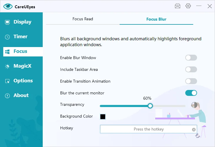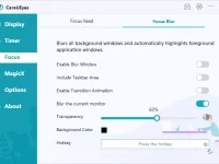 ფოკუსირება (Focus): ეს ფუნქცია საშუალებას გაძლევთ, გამოყოთ ეკრანის მცირე არე (როგორც გამადიდებელი შუშა) და დააბუნდოვნოთ (Blur) დანარჩენი ფონი, რათა კითხვის ან მუშაობის დროს ყურადღება არ გაგეფანტოთ.