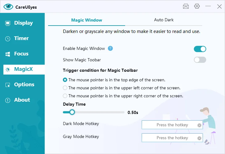 მრავალ-მონიტორიანი კონტროლი (Multi-Monitor Control): თუ იყენებთ რამდენიმე მონიტორს, CareUEyes გაძლევთ საშუალებას, თითოეულ მათგანზე ცალ-ცალკე დაარეგულიროთ ფერის ტემპერატურა და სიკაშკაშე.
