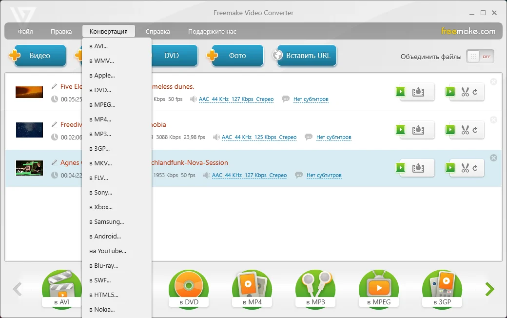 Freemake Video Converter არის პოპულარული და ადვილად გამოსაყენებელი მულტიფუნქციური პროგრამული უზრუნველყოფა, რომელიც განკუთვნილია ძირითადად ვიდეოების კონვერტაციისთვის, ასევე მარტივი რედაქტირებისთვის და მედია ფაილების მართვისთვის. პროგრამას შეუძლია წაიკითხოს და დააკონვერტიროს 500-ზე მეტი ფორმატის ვიდეო, აუდიო და გამოსახულების ფაილი.