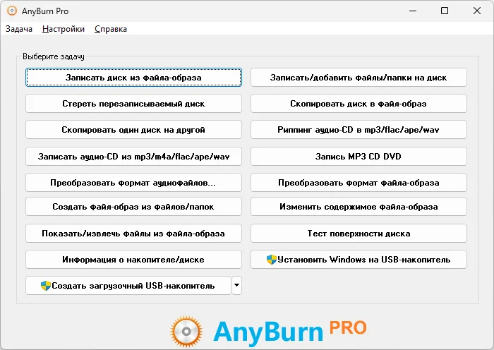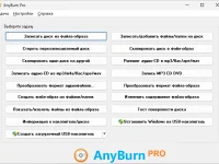 AnyBurn Pro არის მსუბუქი, პროფესიონალური პროგრამა Windows სისტემებისთვის, რომელიც განკუთვნილია დისკების ჩასაწერად, დისკების იმიჯებთან სამუშაოდ (ISO/BIN/CUE) და ბუტაბლური USB დრაივების შესაქმნელად. ეს არის უფასო AnyBurn პროგრამის ფასიანი (Pro) ვერსია, რომელიც მოხსნის შეზღუდვებს და სთავაზობს დამატებით ფუნქციებს.