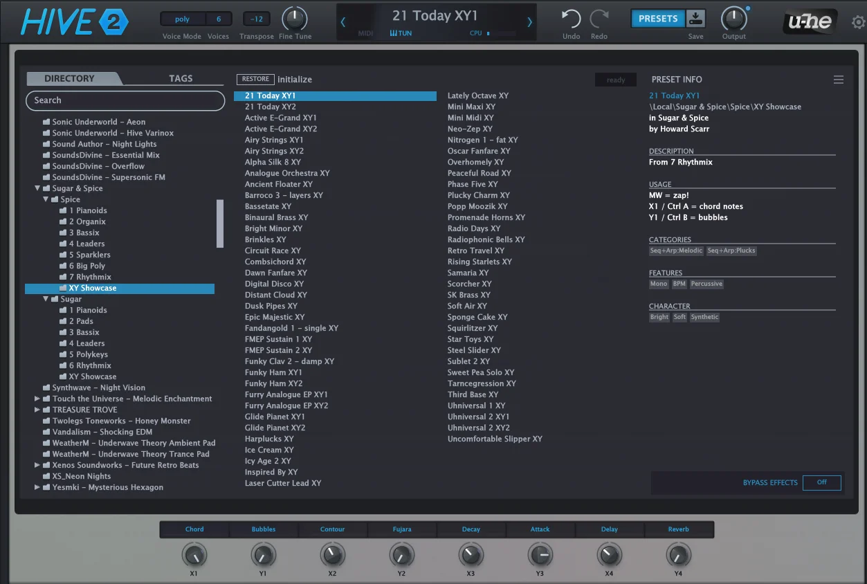 Sugar & Spice მოიცავს 260-ზე მეტ ჟღერადობას, რომლებიც შთაგონებულია 80-იანი და 90-იანი წლების სცენური კლავიშებიანი ინსტრუმენტებითა და პოლიფონიური სინთეზატორებით. მიუხედავად იმისა, რომ წინასწარ დაყენებული პარამეტრები (presets) ორიენტირებულია გამოყენების სიმარტივეზე, უფრო რადიკალური ტრანსფორმაცია ხელმისაწვდომია დაუყოვნებლივ Hive-ის XY-პედების მეშვეობით (100-ზე მეტი ასეთი მაგალითი შეგიძლიათ იხილოთ დამატებით XY Showcase საქაღალდეებში). გამოცდილი კლავიშებიანი ინსტრუმენტების შემსრულებლები დააფასებენ იმ ნიუანსებს, რომლებიც დაკავშირებულია დაჭერის სიჩქარის მგრძნობელობასთან (Velocity Sensitivity) და შემდგომ შეხებასთან (Aftertouch).