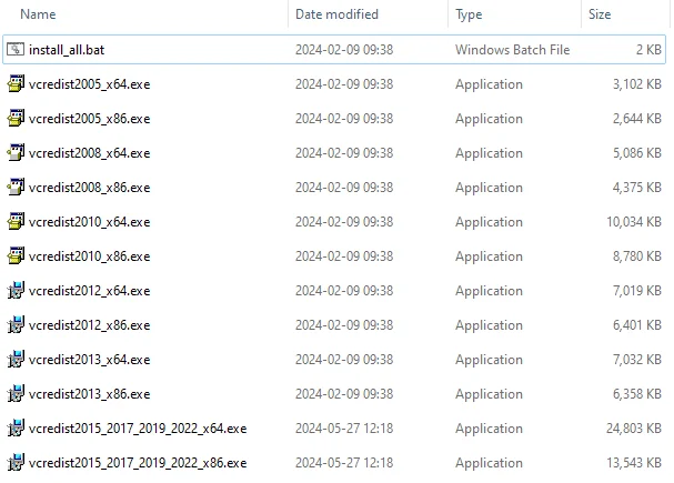 ეს არქივი შეიცავს VCRedist Visual Studio C++-ის ყველა ვერსიის უახლეს განახლებას (2025 წლის დეკემბრის მდგომარეობით). მათი ინსტალაცია შესაძლებელია ერთი ღილაკის დაჭერით, კომპლექტში არსებული საინსტალაციო ფაილის (install_all.bat) მეშვეობით. ინსტალაციისთვის გაუშვით install_all.bat ადმინისტრატორის უფლებებით (მარჯვენა ღილაკის დაჭერით, შემდეგ — „Run as administrator“). პაკეტი მოიცავს Visual C++ 2005, 2008, 2010, 2012, 2013, 2015, 2017, 2019, 2021 და 2022 წლის ვერსიებს. მხარდაჭერილია როგორც 32-ბიტიანი (x86), ისე 64-ბიტიანი (x64) სისტემები. ფაილები წარმოდგენილია ინგლისურ ენაზე. Windows-ის სუფთად ინსტალაციისას ყოველთვის რეკომენდებულია C++-ის ყველა ვერსიის დაყენება, სწორედ ამიტომ შეიქმნა ეს „ყველაფერი ერთში“ ნაკრები. ის დაგეხმარებათ თავიდან აიცილოთ ისეთი შეცდომები, როგორიცაა: "side-by-side configuration is incorrect", "Missing MSVCRT.DLL", "VCRUNTIME140_1.dll was not found" ან "MSVCP140.DLL.