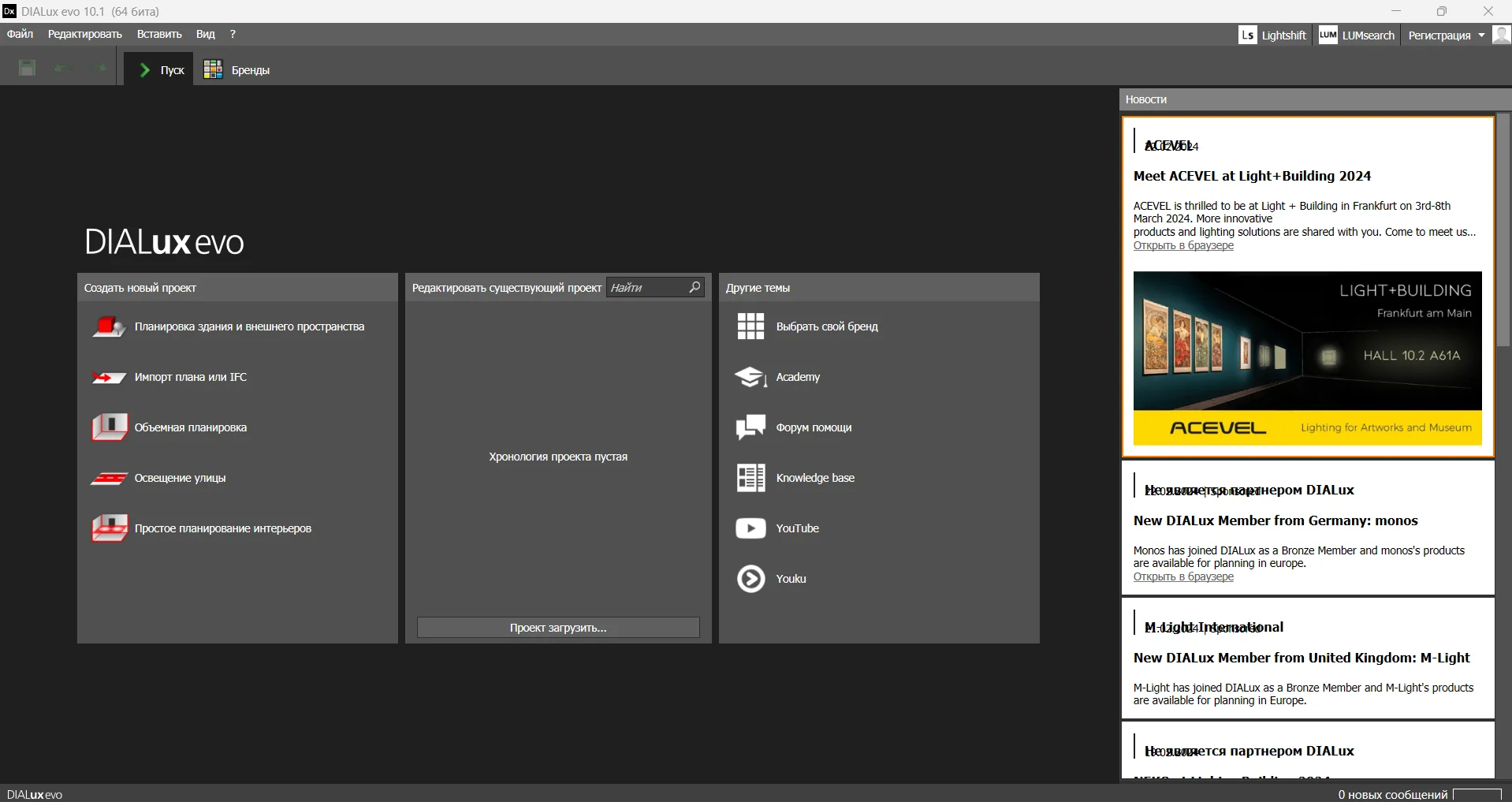 ! პროექტები, რომლებიც შექმნილია DIALux-ის უფრო ახალ ვერსიებში, ამ ვერსიაში ვერ გაიხსნება. !